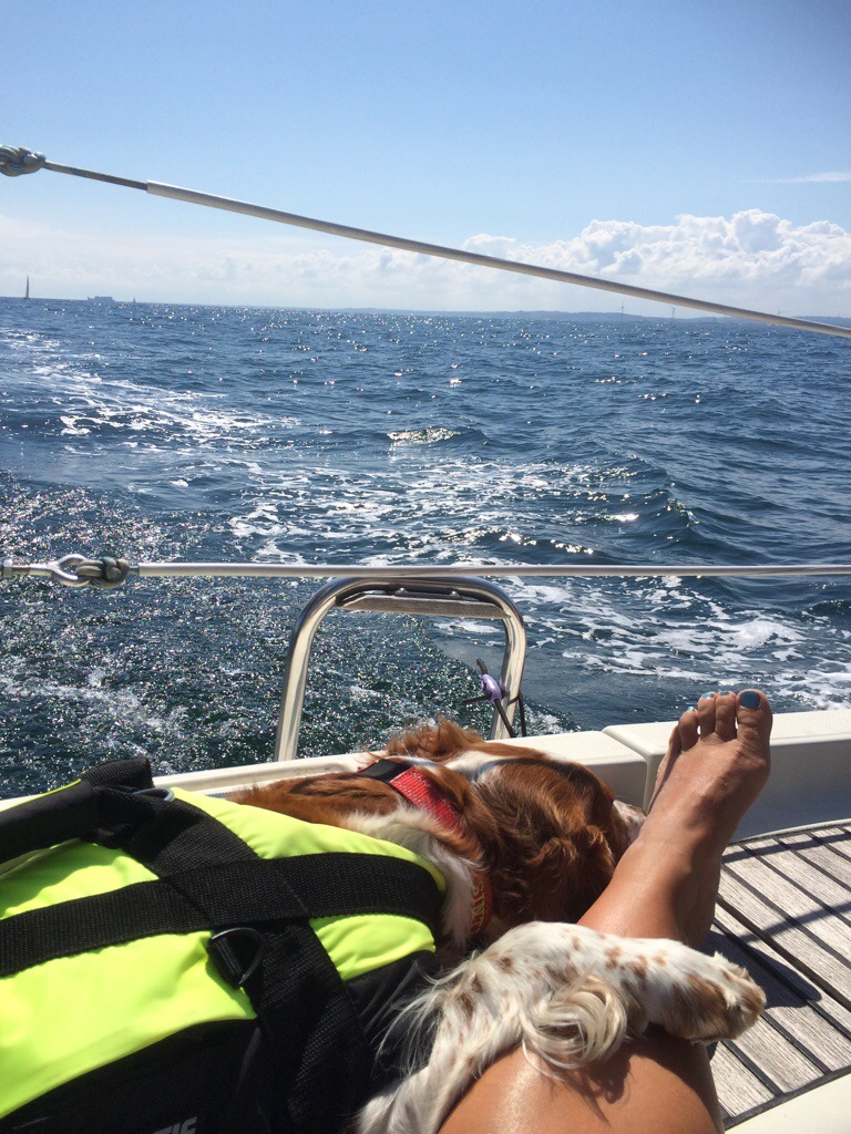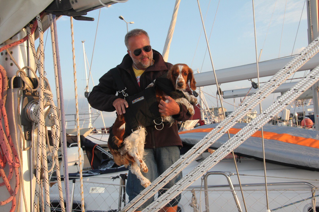 Här är mycket båt och vi hamnade som sjätte båt från land. Med hund ombord innebär det en del bärande så idag blev det premiär för den bärsele som maken köpt från USA. Den funkade riktigt bra och visst ser hon nöjd ut i den? Helt stilla och lugn var hon.