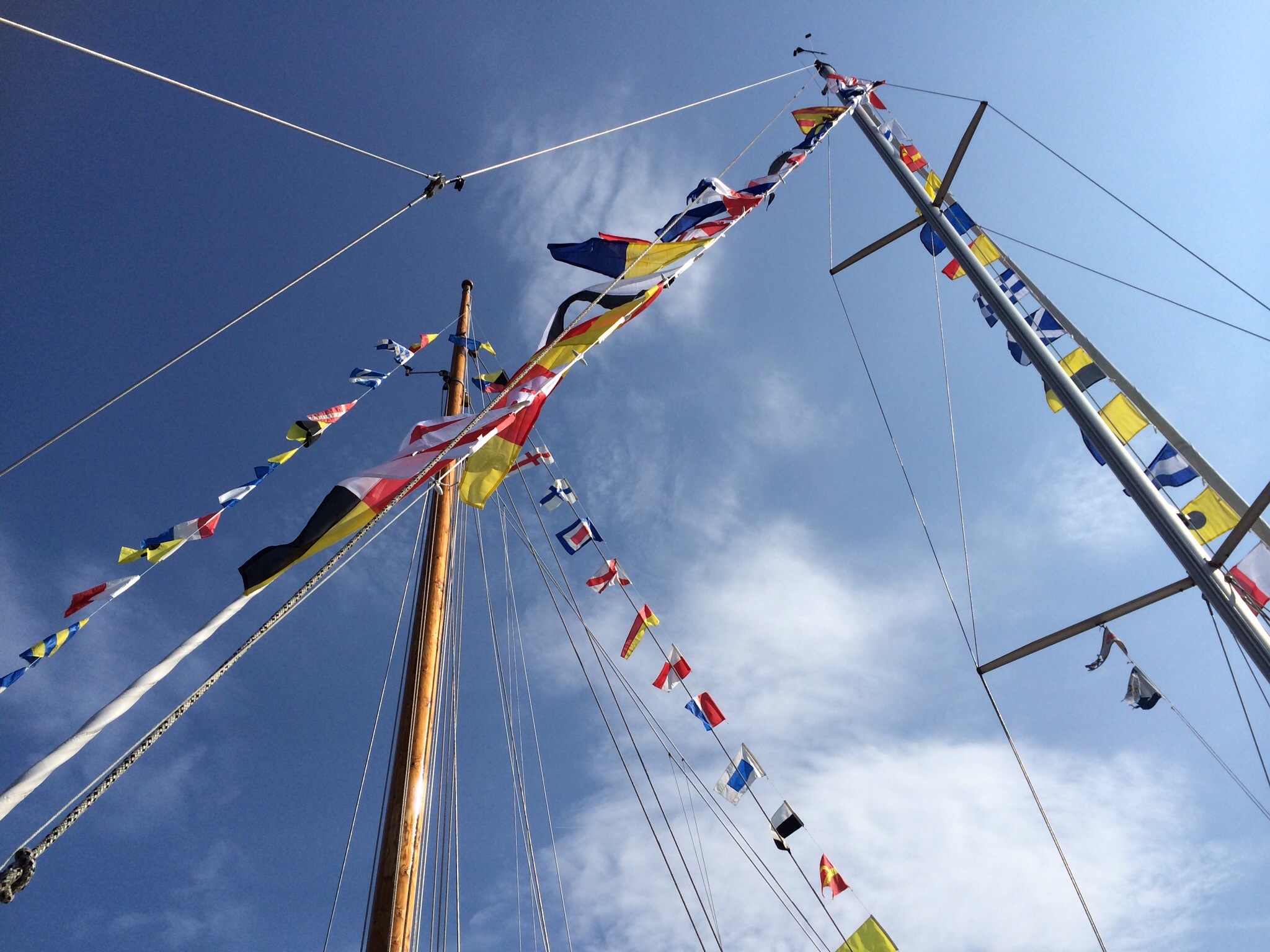 Jo, för det var dags för bröllop. Goda vänner gifte sig och lyckades pricka en fantastisk dag att göra det på. Det var sol, det var varmt och till och med badbart i vattnet. För badade gjorde både maken och jag innan vi piffade till oss inför vigseln. Ja, vi piffade båten också så klart, med flaggspel. Det smattrade i den lilla vind som fanns men var fint mot den blåa himlen.