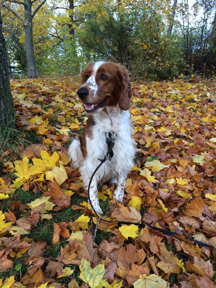 Det är härlig höst här och löven singlade från träden och frasade under fötterna när Sintra och jag tog en morgonpromenad runt Herrgården. Hon var glad som en speleman och skuttade lite extra (verkade det som) bland löven. Säkert för att det prasslar så roligt.
