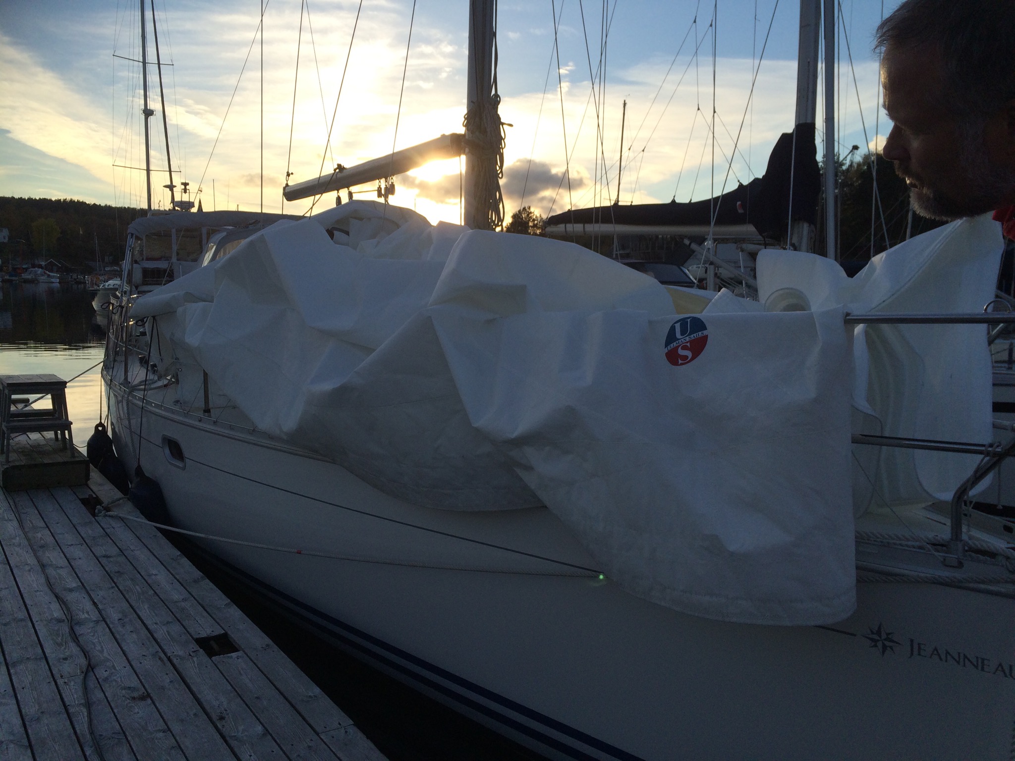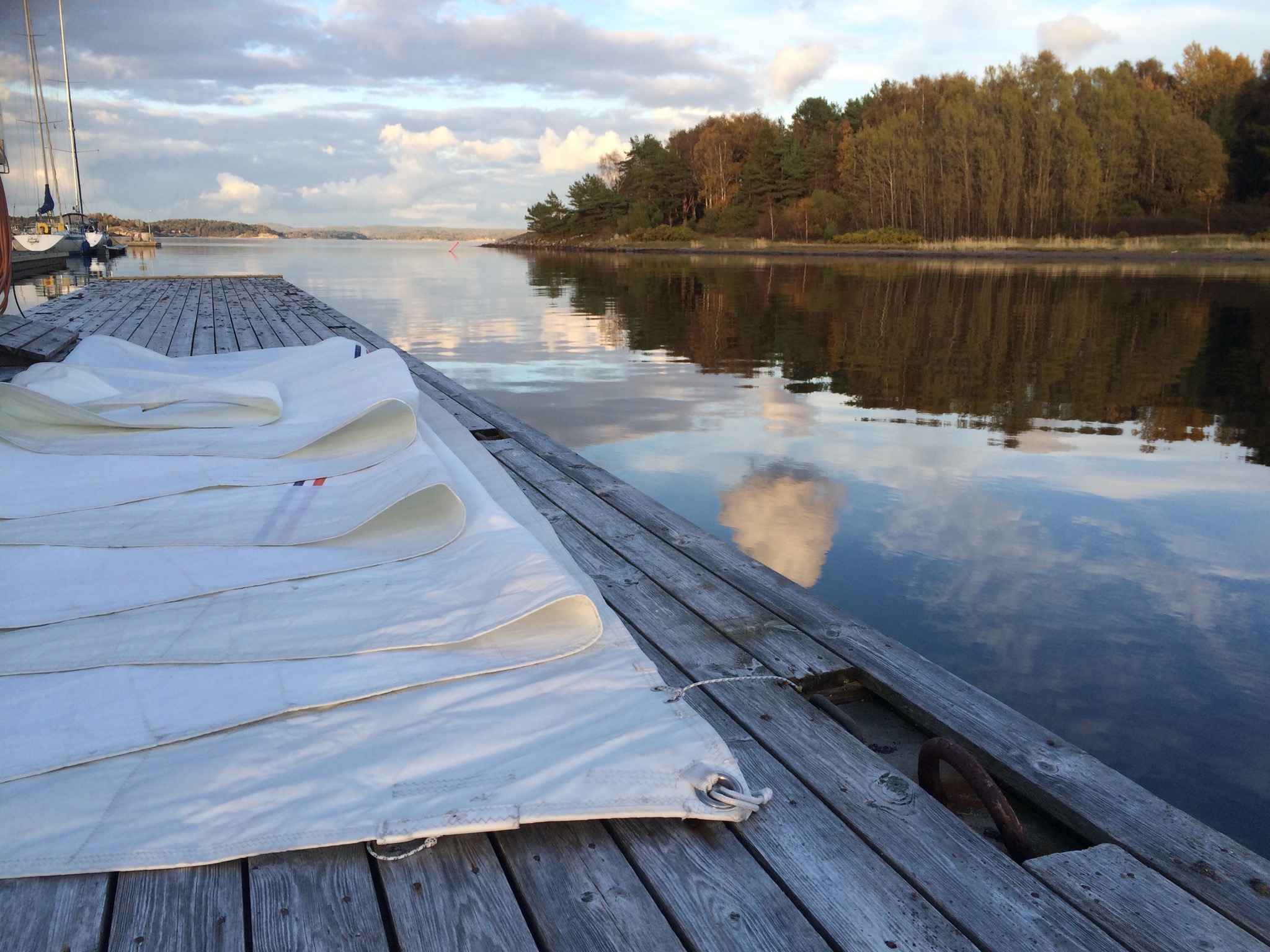 Så – idag var vädret bättre än bäst för det. Sol och nästan helt vindstilla. Särskilt lång tid tar det inte men de är otympliga. Det är många kvadratmeter som ska vikas och blåser det blir det väldigt jobbigt. Men – nu är det gjort och seglen ligger undanstuvade i garaget. I väntan på våren,