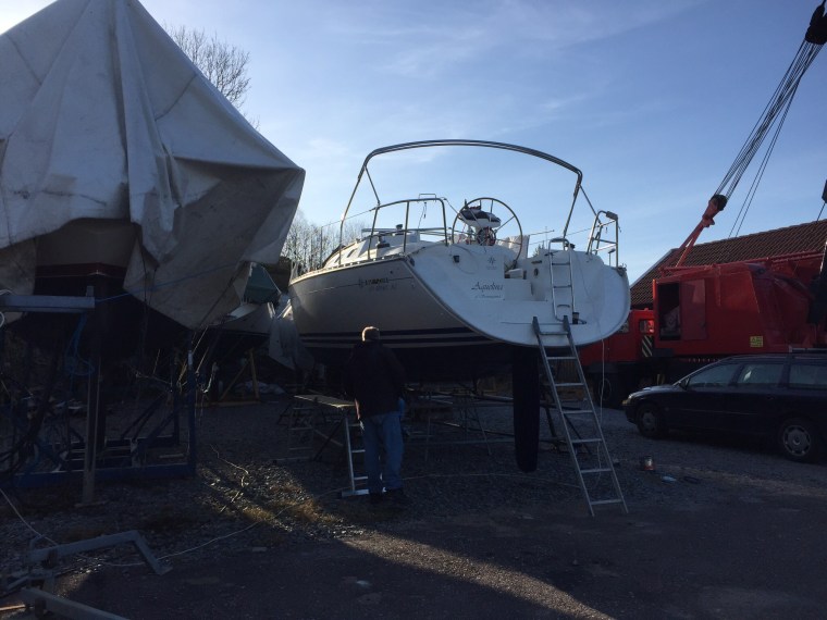 Sommartid tycker jag det är bra att vi har en båt som inte sticker så djupt men när det ska bottenmålas hade jag önskat lite mer luft under så att jag inte hade behövt krypa. Maken, som polerade skrovsidorna tills det gick att spegla sig i dem, har nog mer uppfattningen att han stod tillräckligt högt upp…