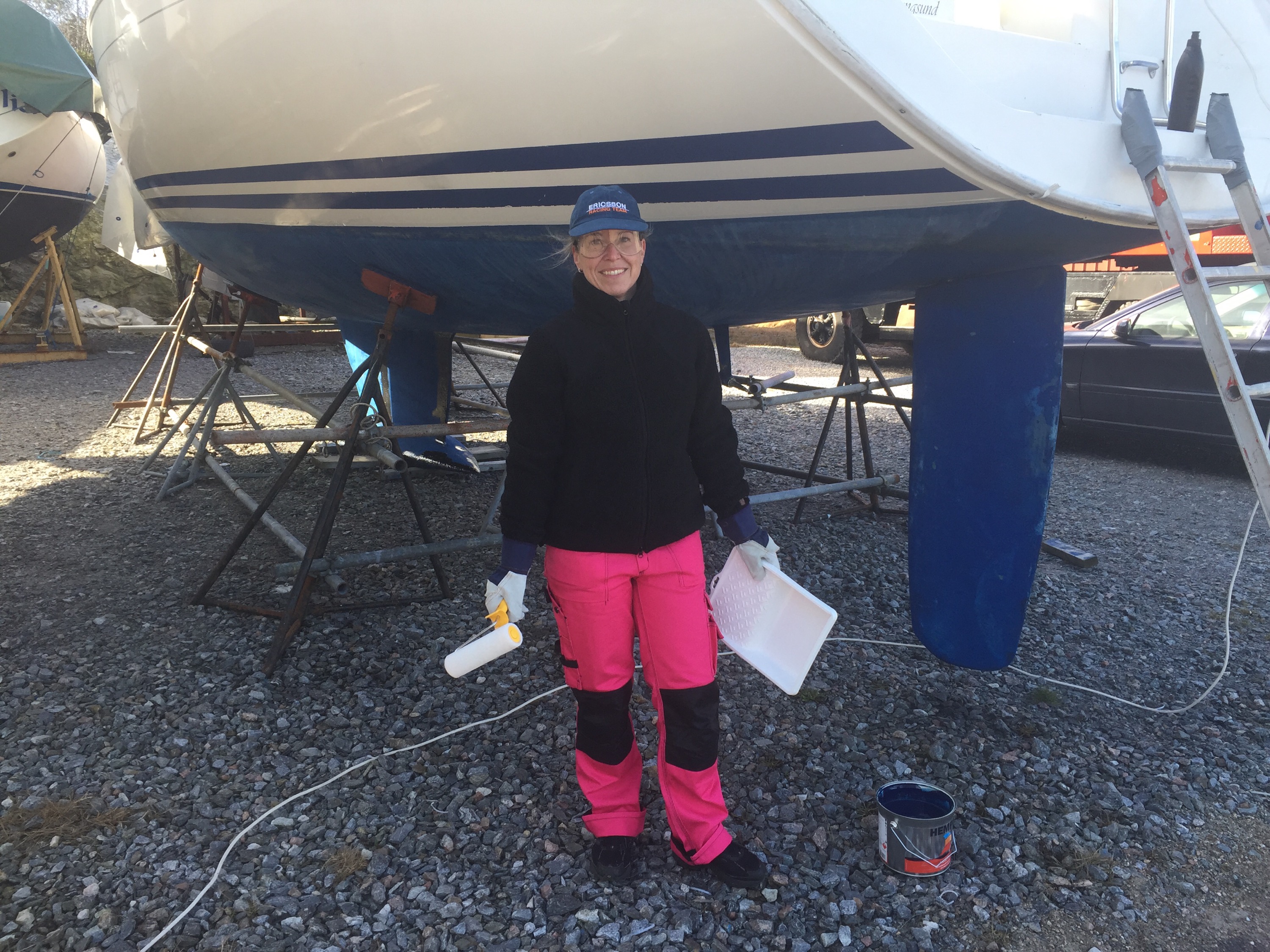 Med blå himmel och lite varma grader går båtjobb som en dans. Med en lite kylig nordostan är det lite mer…. obekvämt. Jag höll dessutom mest till under båten och bottenmålade den. Där, dit solen inte nådde. Med skyddsglasögon, keps och nya jobbarbyxor gällde det sedan att försöka undvika att komma när båten. Här och där är det aningen tricky…