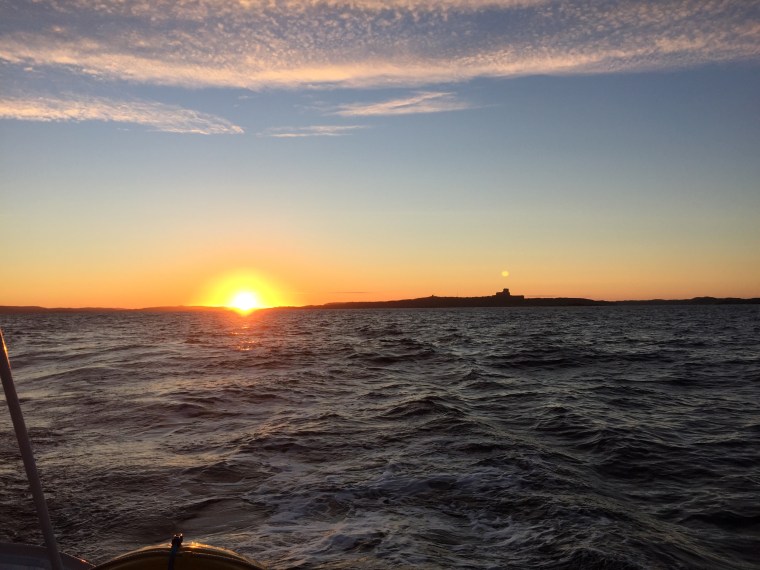 Det blåste noll och ingenting och sjön var skumpig efter fredagens kuling men en vacker soluppgång över Marstrand fick vi se och allt eftersom lade sig sjön och blev platt.