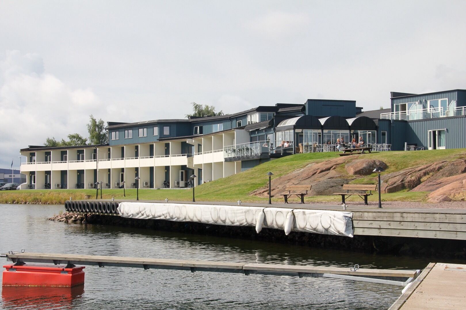 Det var lite på vinst och förlust som vi bokade in oss på Corallen i Oskarshamn. Jag menar, det är ju inte så att vi är på ostkusten särskilt ofta. Första intrycket med småbåtshamn utanför fönstret och uteplatsen var mycket positiv, rummen betydligt bättre än korridorerna antydde och sängarna var sköna. Nu har vi även avverkat frukosten och även den var riktigt bra. Och då är jag rätt kräsen. Äggröran brukar vara en viktig parameter för mig och den som serverades i morse var riktigt bra.