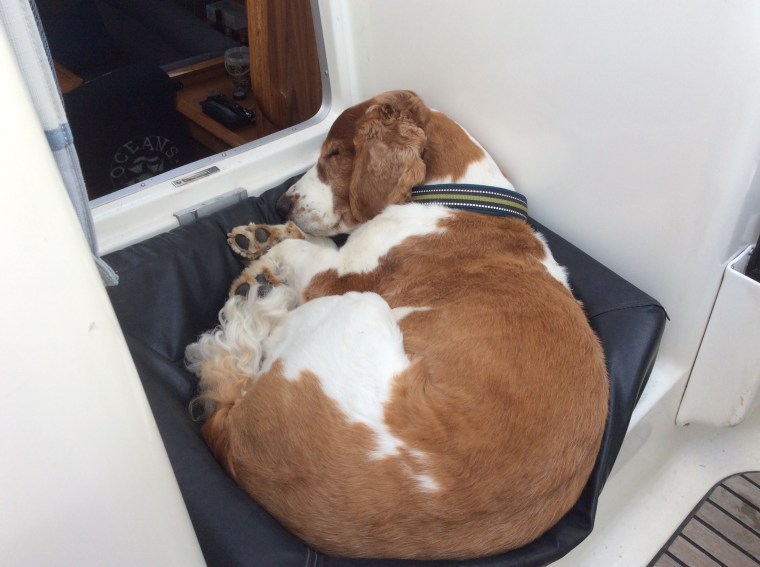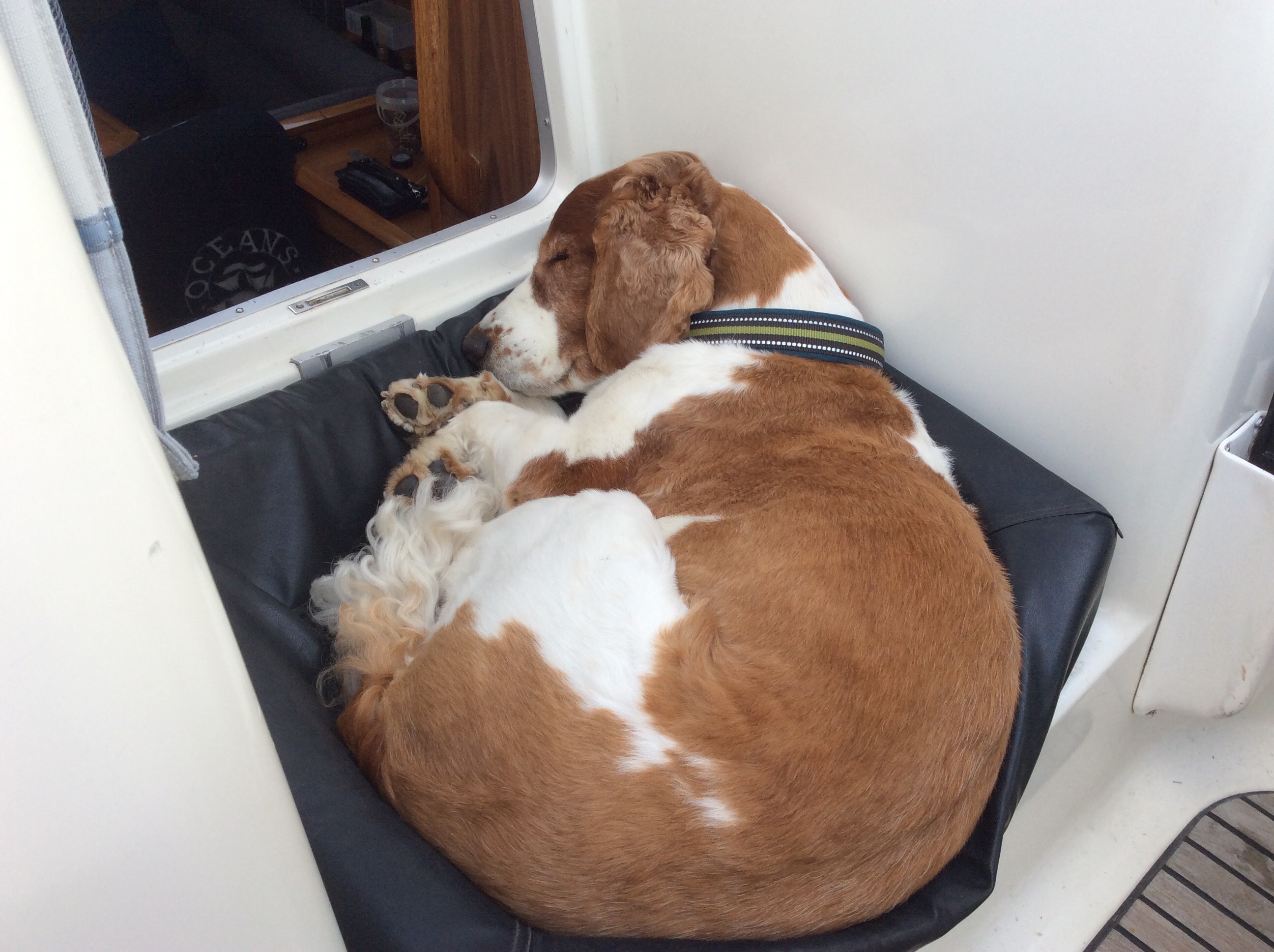 Och så har han gjort den andra akterkabinen till sin. Där sover han på natten. Tur att vi har tre kabiner i båten. 😜