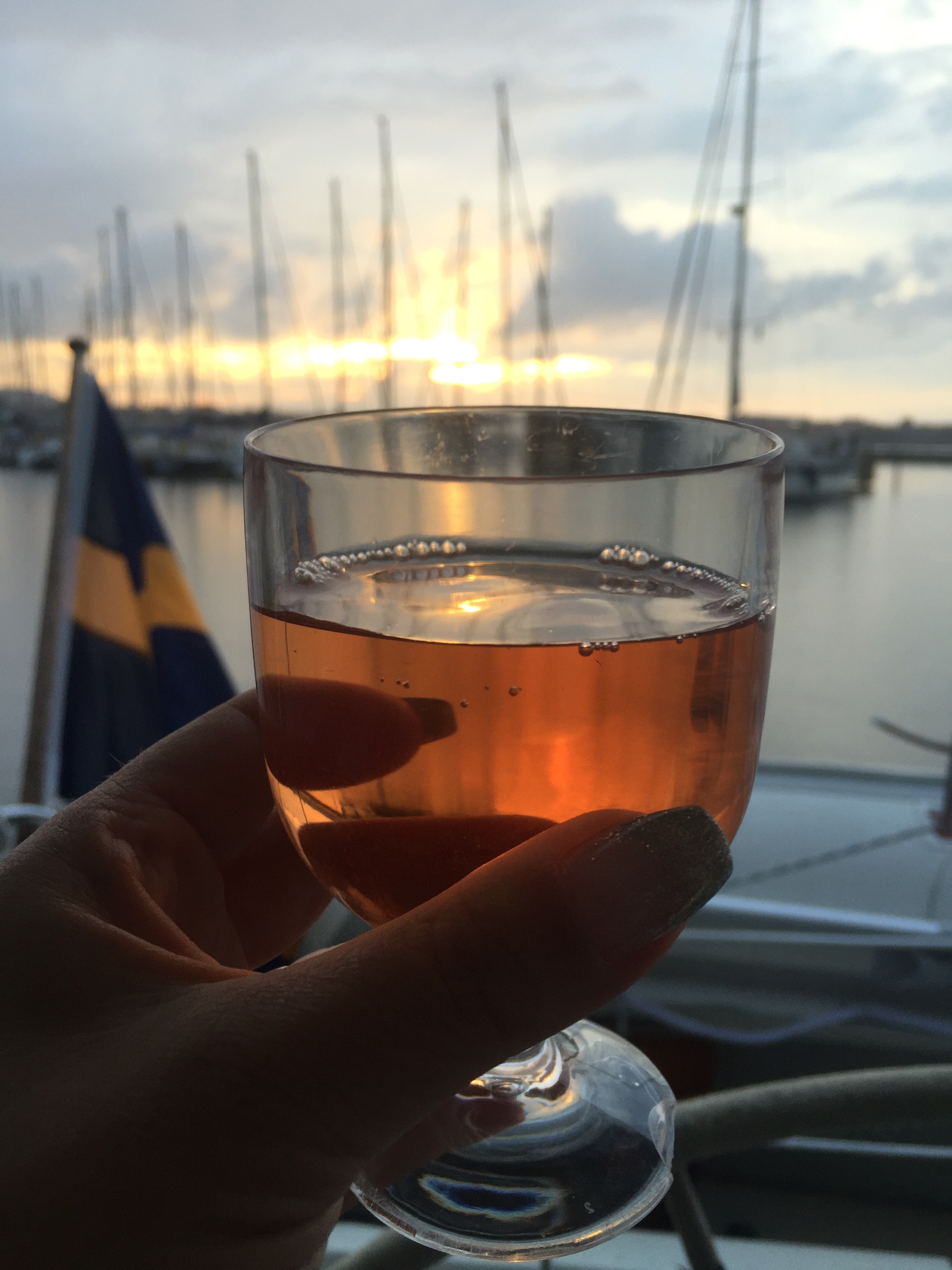 Efter sju timmar på havet och med regnet smattrande var vi väl värda ett glas vin.