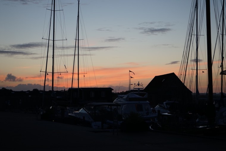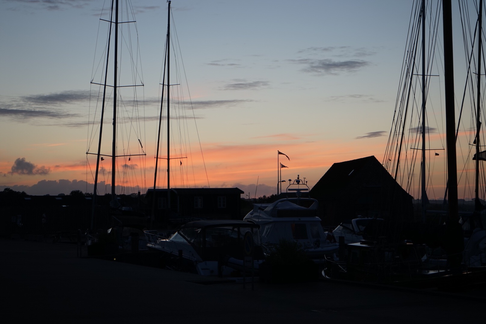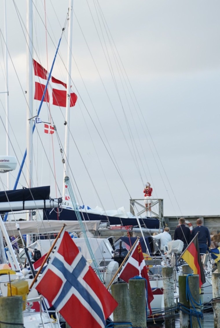 En av många trevliga saker med Sæby är att varje kväll kl 21 halas den danska flaggan till trumpetspel. Så även igår. Den här gången hade vi första parkett från båten.