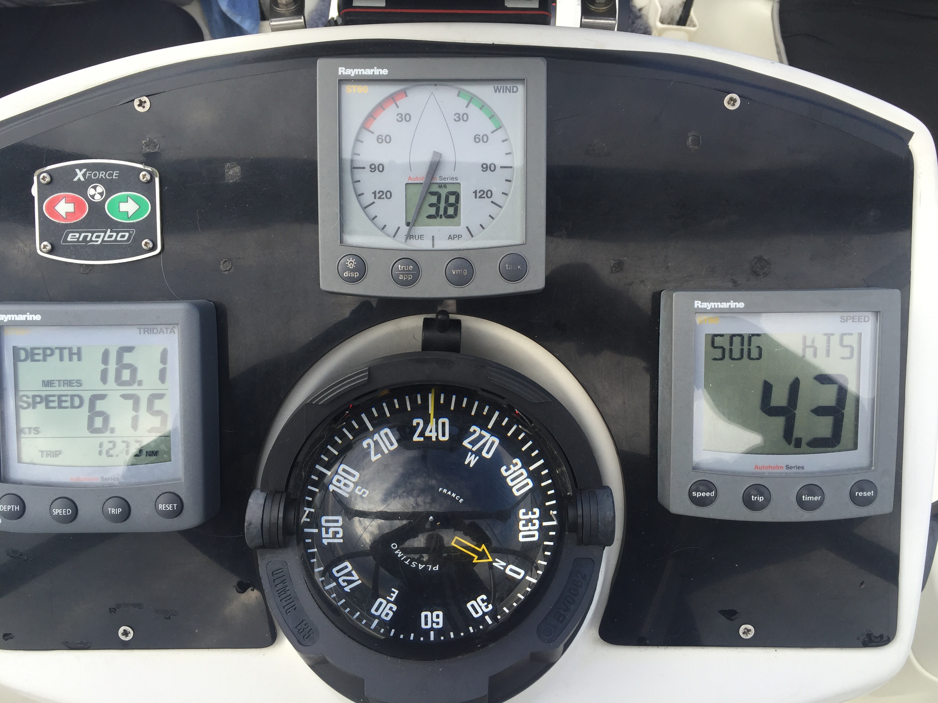 Det tog lite längre tid än vi hade tänkt oss idag. Strömmen satte med runt 2 knop mot oss. På den vänstra mätaren står det speed 6.75 och på den högra vilken fart vi gjorde trots motströmmen. Två och en halv knops skillnad gör en del.