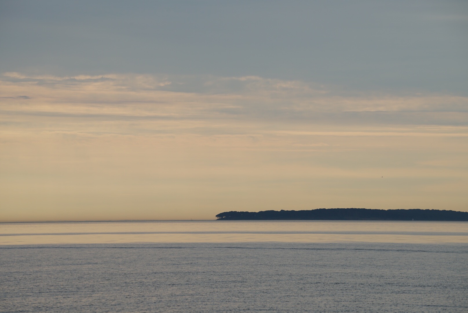 Vädret idag började med duggregn men bjöd också på vackra färger på himlen. Lite senare var det disigt för att klarna upp helt ungefär samtidigt som vi lade till.