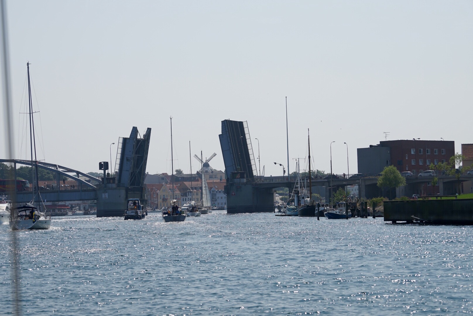Precis innan man kommer fram till Sønderborg måste man passera en öppningsbar bro. Våra kompisar hann slinka igenom men när vi närmade oss var den på väg att stängas. Visst, vi hade säkert hunnit men röd lampa är röd lampa även när det handlar om en halv minut.