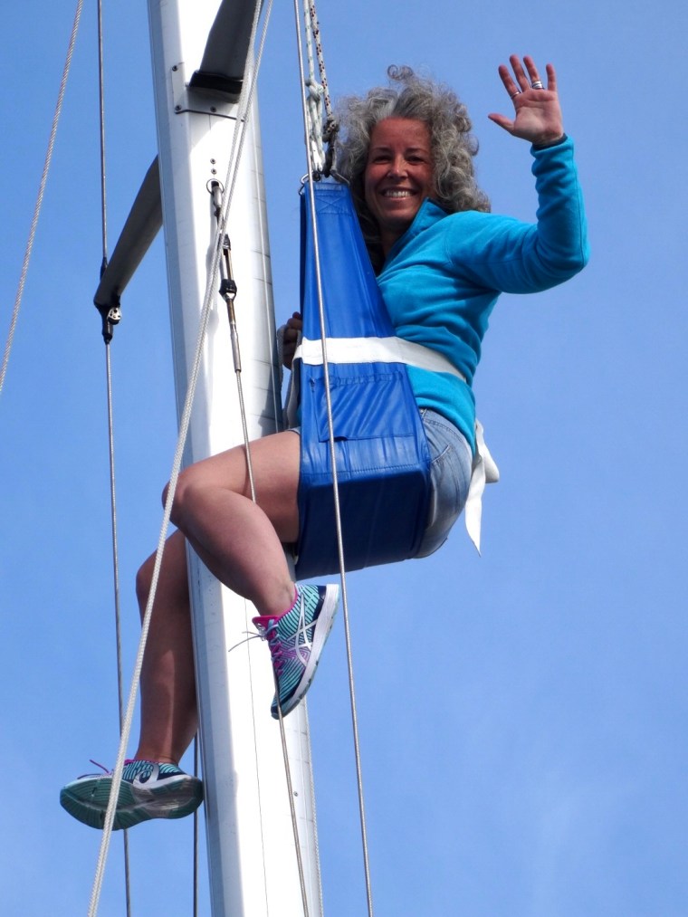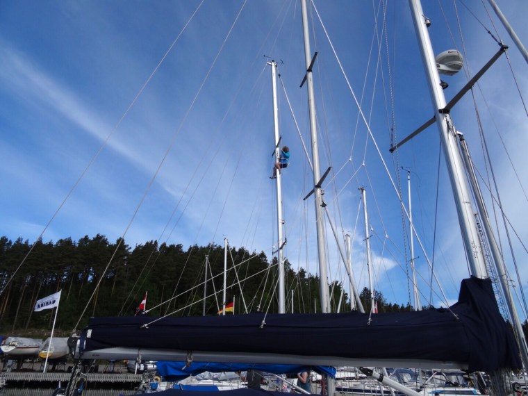 Dagen började lugnt och innan vi lämnade hamn hjälpte jag kompisarna i Caprice (deras båt heter så) med lite grejer i deras mast. Jag är inte det minsta höjdrädd och tycker till och med att det är lite kul.