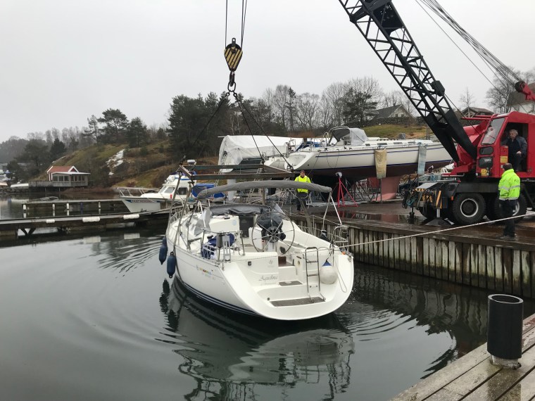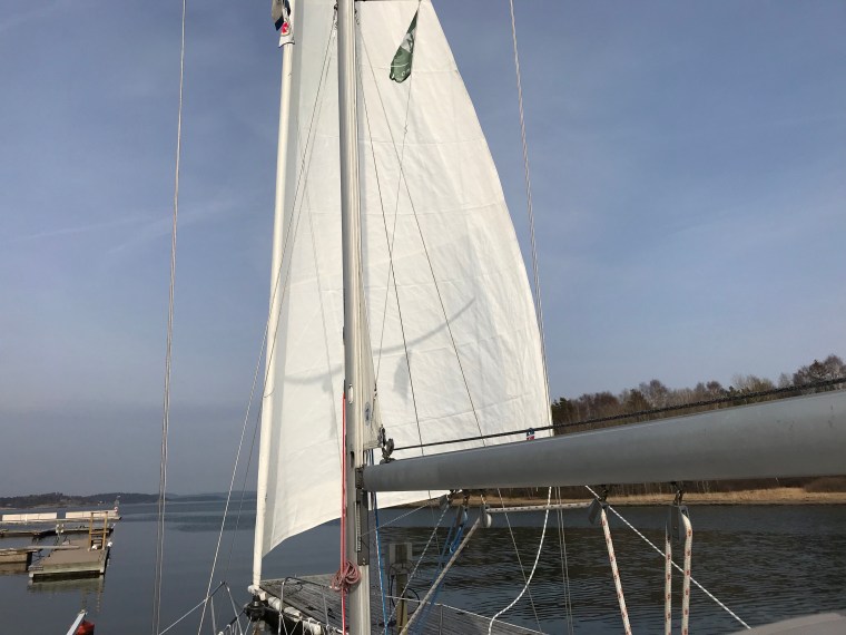 Helt sjukt egentligen men maken gjorde en kämpainsats. Efter sjösättning väntande påmastning och därefter skulle seglen monteras. Det var då jag drog på mig ryggskottet. Det klassiska att lyfta (en segelsäck) och så en liten vridning på det. Men på är de. Seglen alltså.