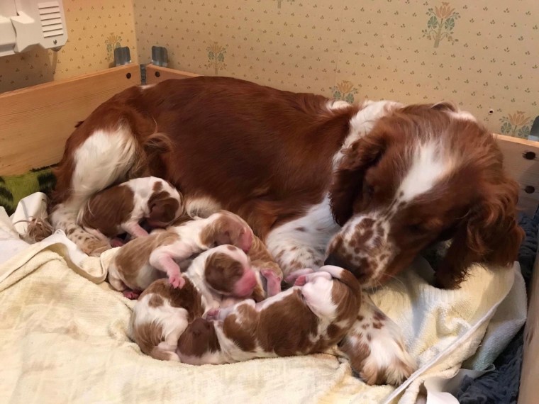 Halv åtta ringde telefonen. Det var vår kennelmatte som berättade att yngsta dotters hund Gnista hade fått valpar under den senare delen av natten / tidigare morgonen. Det blev till att ringa runt till döttrarna och snart smattrade det i telefonerna av meddelanden fram och tillbaka.