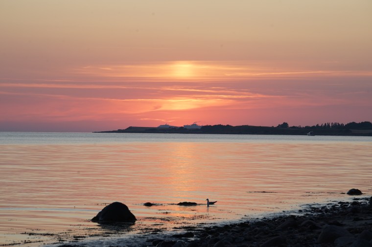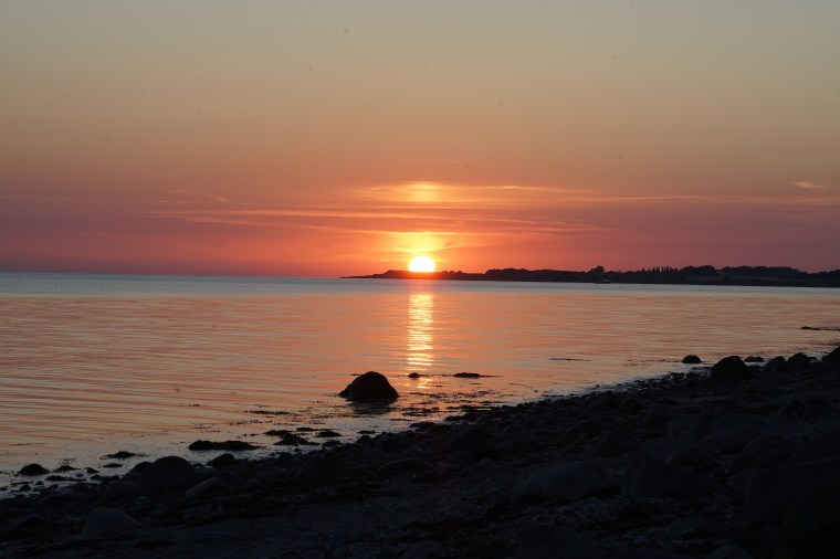 Vi hade hört att man kunde se solen gå ner i havet från Sejerø. Det stämde nästan… och efter en promenad längs havrefält, en klättring nerför ett stup och otaliga flygfän fick vi ändå se en fin solnedgång som nästan gick ner i havet.