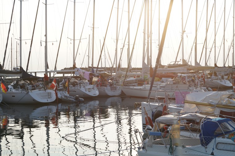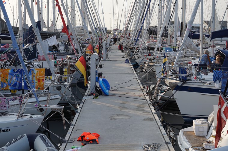 Vi halv elva var vi framme och hittade fina platser i hamnen. Kommer man sent hit får man bli kreativ och båtarna ligger lite hur som här.