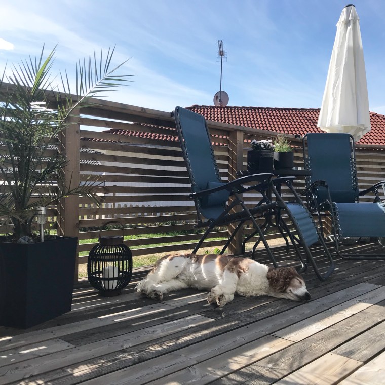 Äldsta dottern har passat Philip under vår semester. Eller egentligen passat vårt hus OCH Philip. Vi brukar ju ha honom med på båten men när dottern erbjöd sig att ha honom hemma fick vi möjlighet att planera för lite längre avstånd med båten. Har vi hund ombord vill vi inte gärna gå längre än 6 timmar och i Danmark är det långt mellan hamnarna.