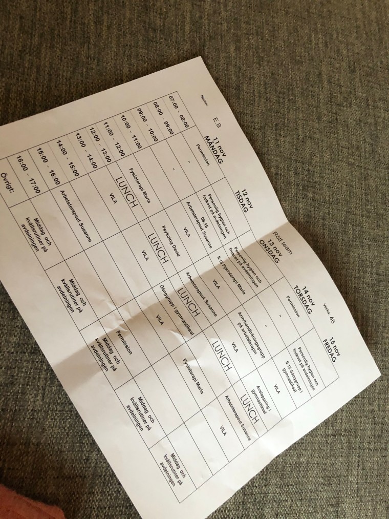 Efter mötet, som maken också var med på, åkte vi hem för helgpermission. Schemat för nästa vecka är lite mer intensivt och det är förståeligt då första tiden nu varit bedömningar för att fastställa var jag är och mitt behov. Lite luft finns det i schemat för vila men det känns ändå hanterbart