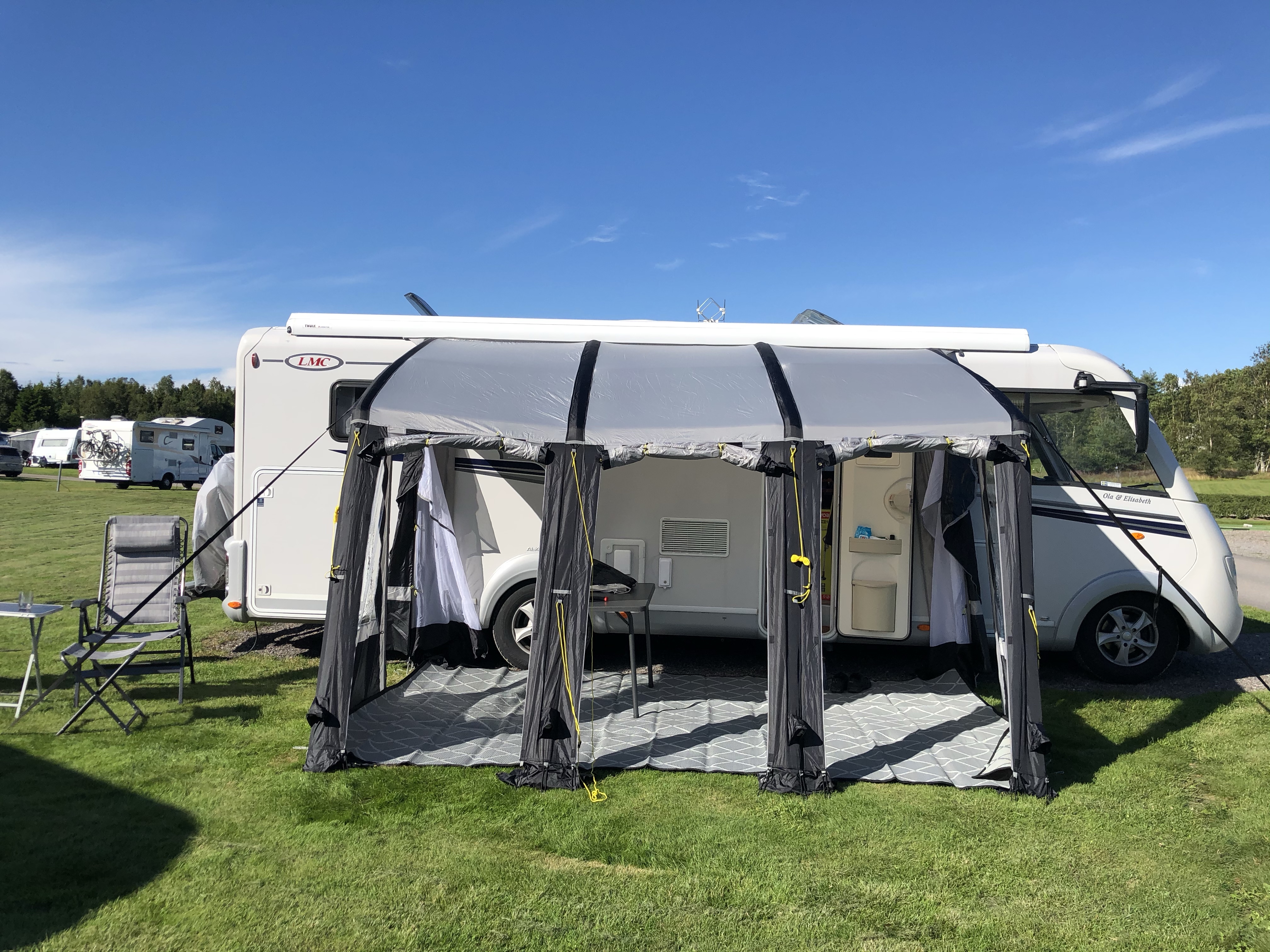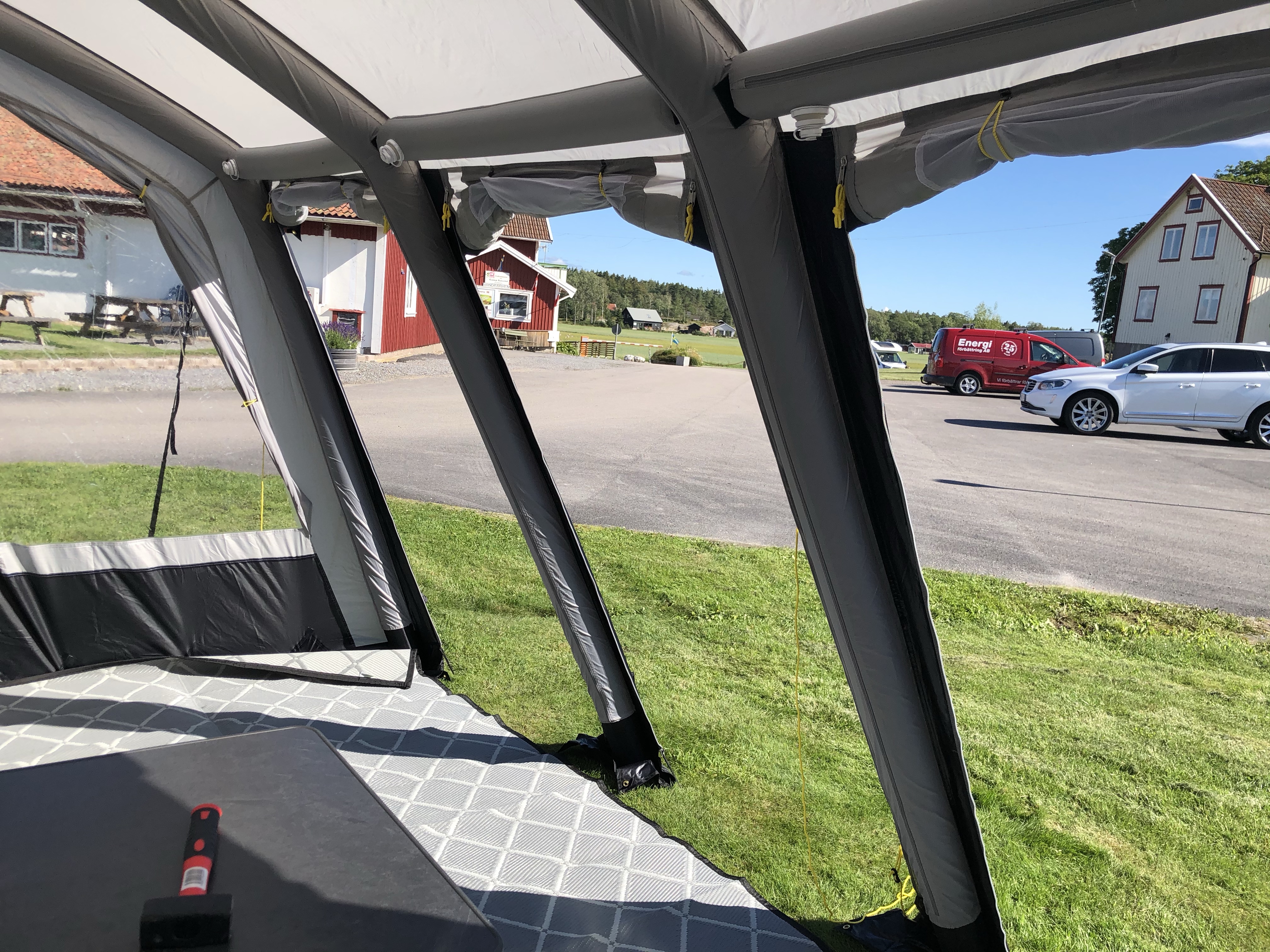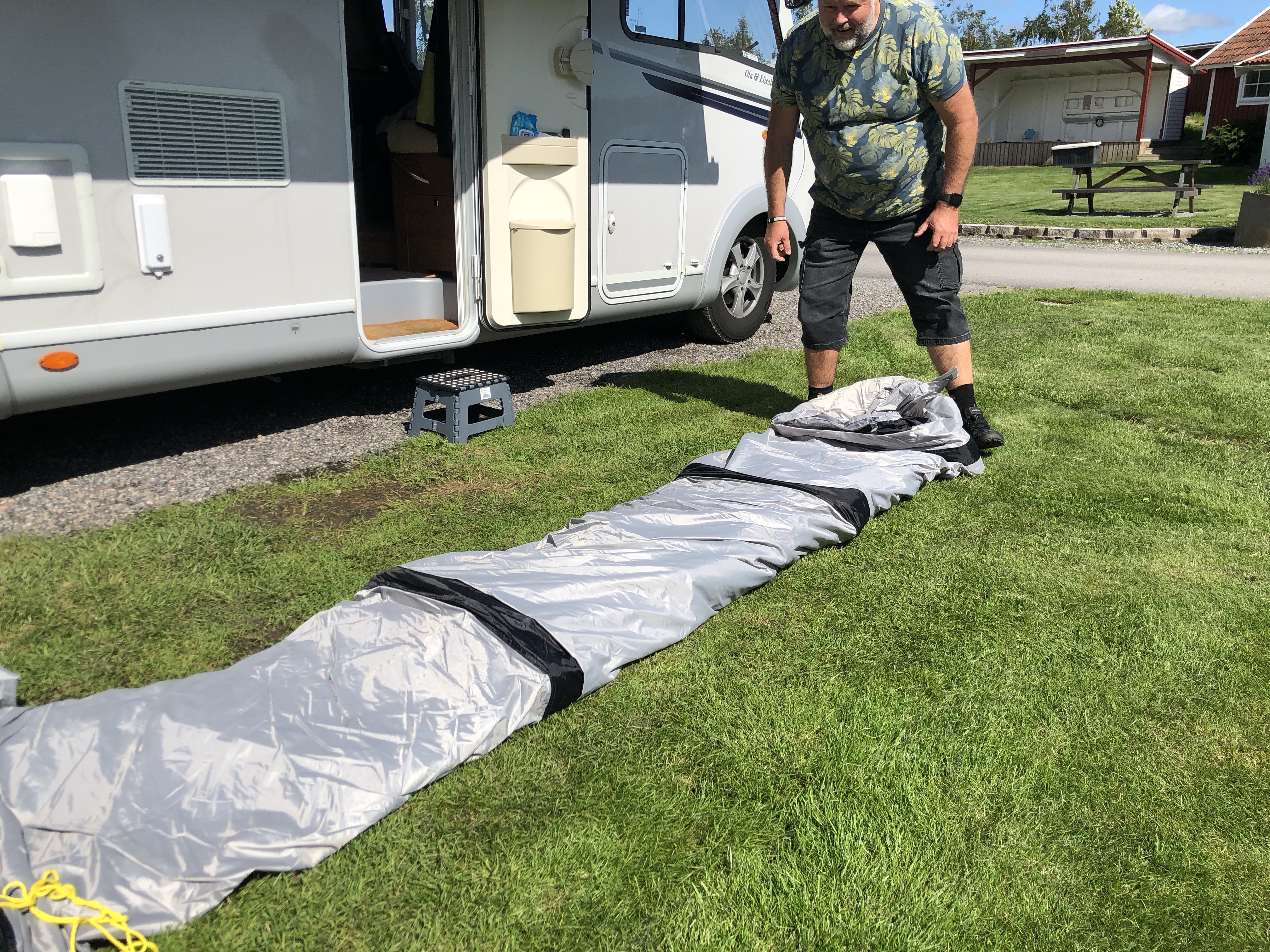 I ich med att husbilen ska stå stilla har maken monterat lufttältet. Det ger oss ett extra rum. Tyvärr kunde jag inte bidra med så mycket mer än glad tillrop och uppmuntran men mer behövdes inte och nu står det på plats.