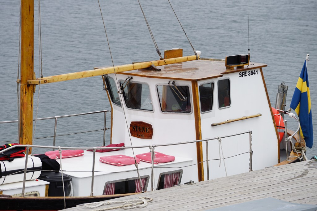 Det var samling i norra hamnen i Lysekil där vi fick ta på oss flytvästar. Vi åkte med gaffelriggaren Signe.