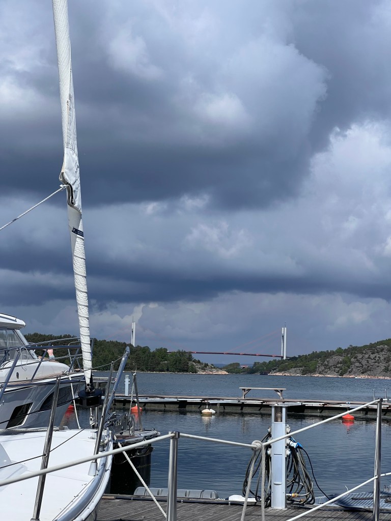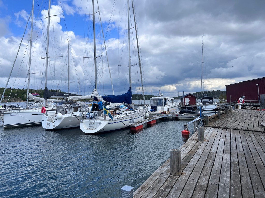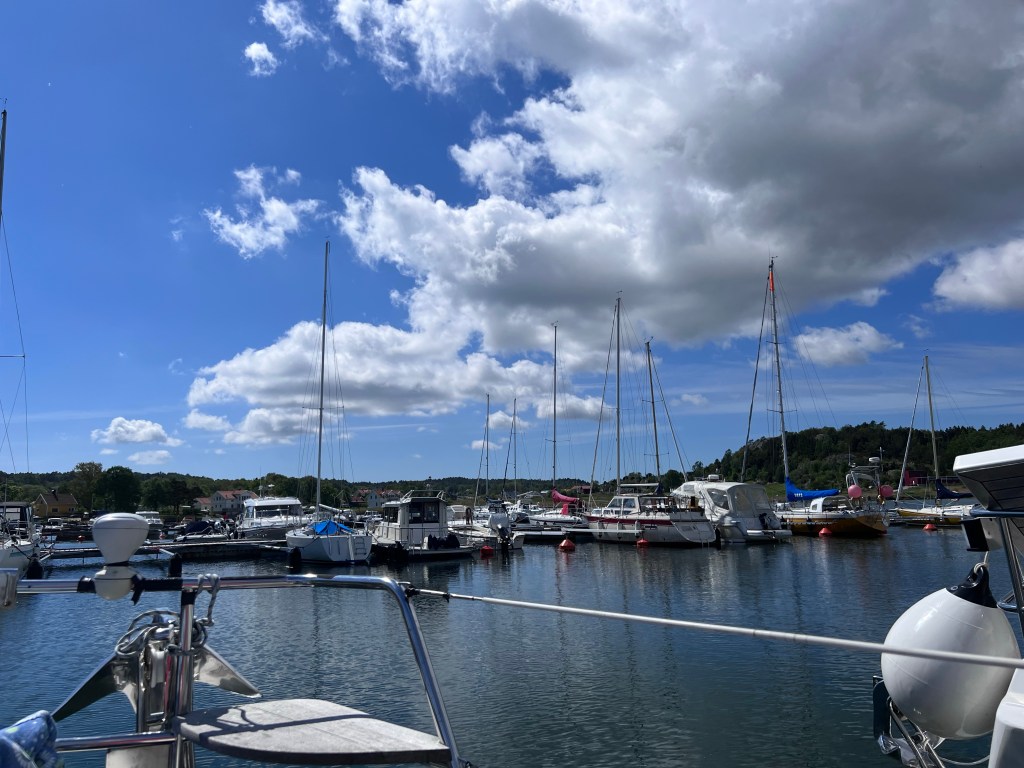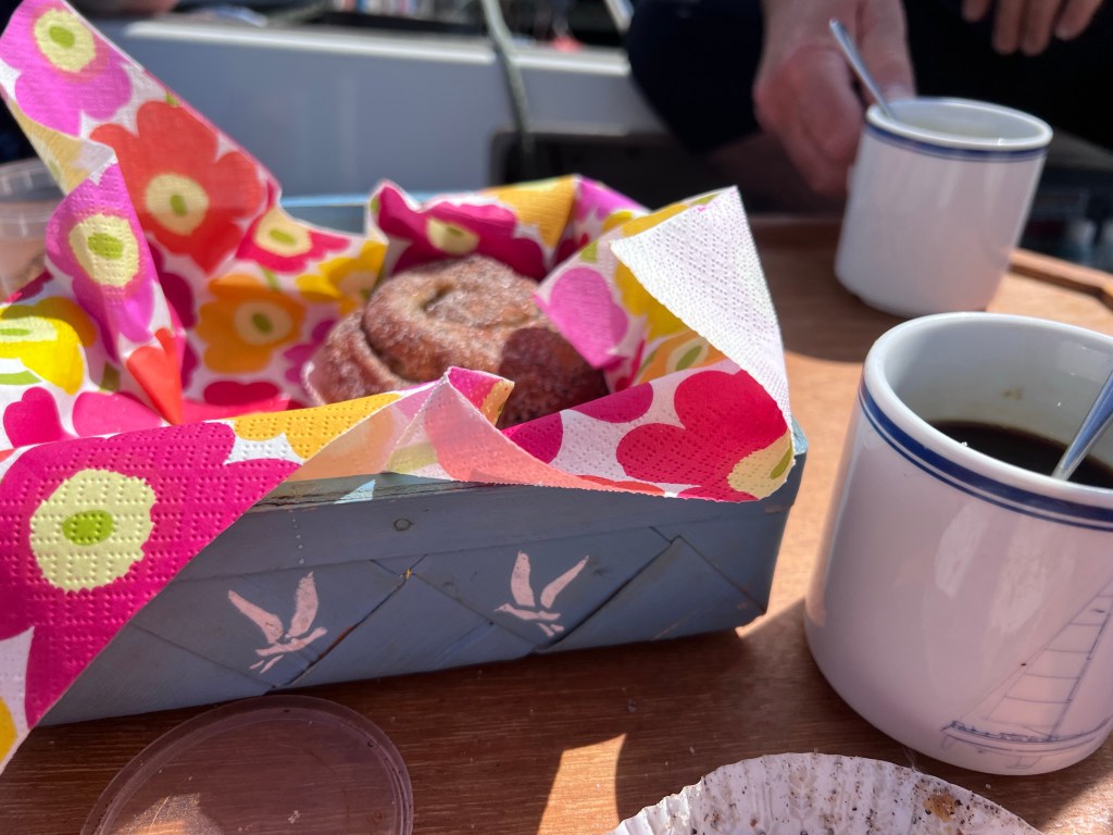 Vännerna ringde. De var i båten och grejade och tyckte att vi skulle komma och fika med dem. Vi hade inga andra planer så vi tackade ja till inbjudan och köpte med oss bullar.