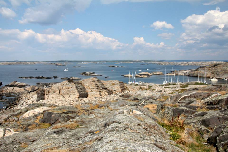 Klippor på Ursholmen i Bohuslän. Här syns ”hin håles harvedrag” som diabasgångarna (det svarta) i gnejsen kallas. Det intressanta är att följa de svarta klipporna och se att samma svarta dyker upp på andra sidan vattnet också – på nästa ö. Riktigt häftigt tycker jag.