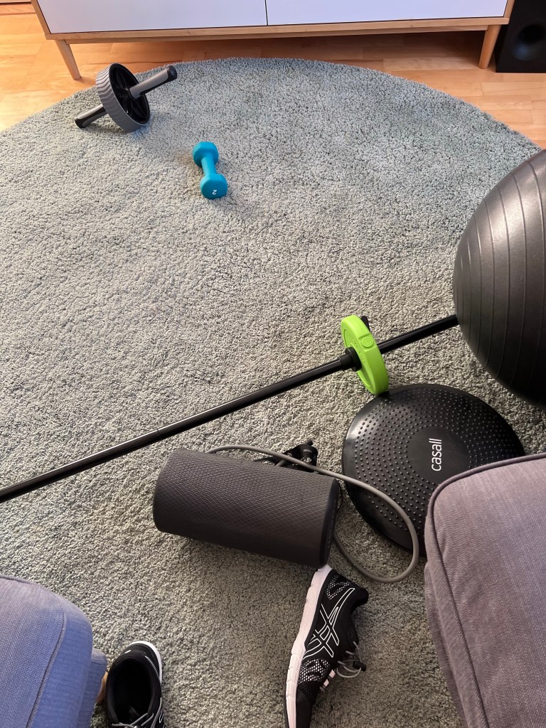 Tränade på Friskis under hösten men nu blir det hemmaträning för hela slanten. Och promenader utomhus. Crosstrainer, roddmaskin, pilatesboll och en nyinköpt skivstång räcker ganska långt.