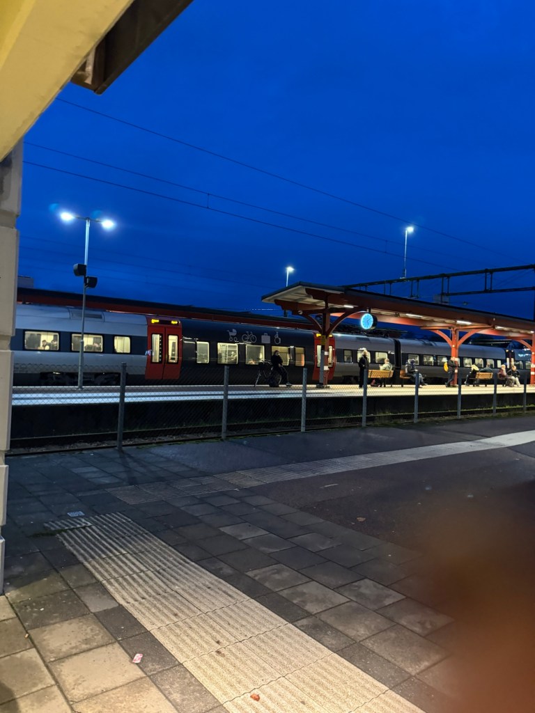 Tyvärr blev det försenat och samtidigt som vi rullade in till Göteborgs central såg jag mitt tåg rulla iväg. Fick bokat om biljetterna då det innebar att jag skulle missa min anslutning i Halmstad. Medan jag väntade på min avgång stötte jag på en vän som jobbar på stationen och vi fick en trevlig fikastund. Väl på tåget med tre minuter innan avgång kom jag på att jag hade glömt min ryggsäck på caféet. Hann turligt nog att hämta den och innan dörrarna stängdes