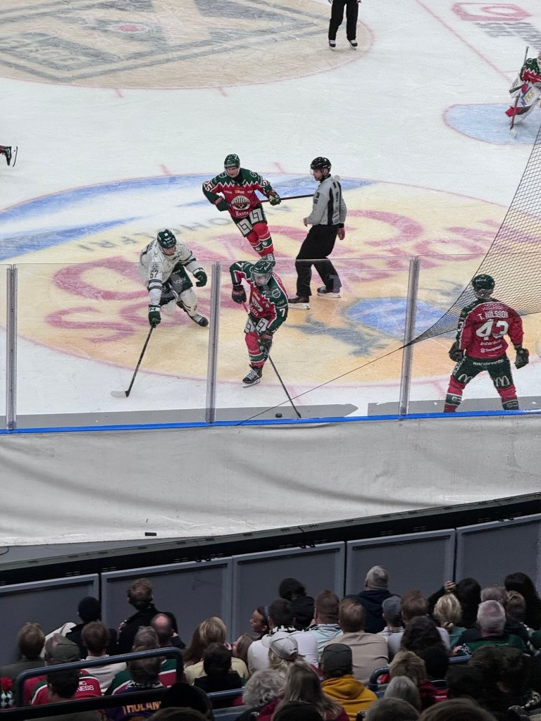 Efter min stroke har jag återfått två intressen från tonåren. Lite konstigt men så har det blivit. Hårdrock och hockeylaget Färjestad. Idag mötte Färjestad Frölunda i Skandinavium och maken och jag hade biljetter. Det blev en händelserik match som tyvärr inte vanns av Färjestad.