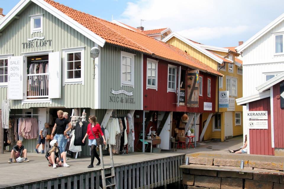 Framme i Smögen fick vi finfin längsplats (båtens sida ligger mot bryggan). Att ligga så gör livet mycket enklare om man har hund, vilket vi har, för då slipper man vrida sig runt segel och annat, bärandes på 20 kg hund, när man ska gå i land. Och gå i land vill man göra i Smögen. Det finns ju typ miljarder med affärer och även om den stora kommersen inte riktigt verkar ha dragit igång bidrog jag lite till dagskassan i Tenson-butiken.