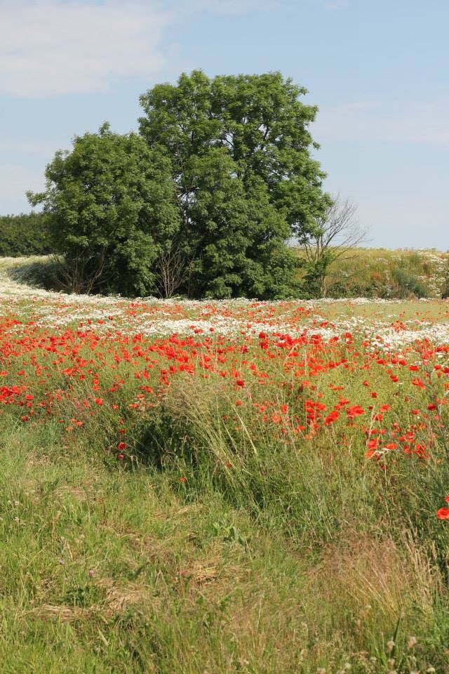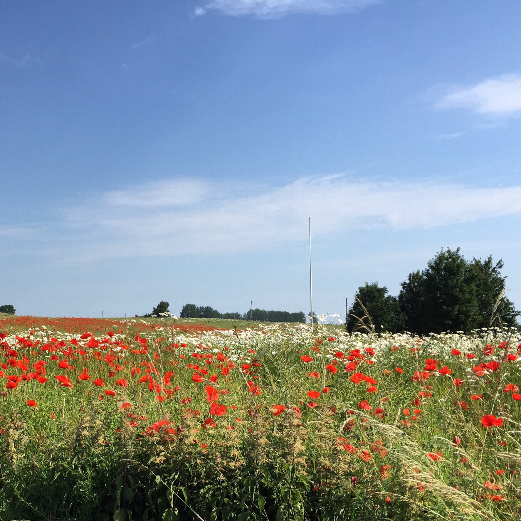 På väg hem efter kalas i Borrby tog vi vägen om Trelleborg för att hälsa på vänner. Man kan då antingen köra snabbaste vägen eller så kan man ta kustvägen. Vi valde kustvägen som också visade sig vara mycket vacker. Innan vi kom dit fick vi dock njuta av stora fält längs vägen. Fält som var rödprickiga av vallmo. Det är så olikt mot min vanliga miljö och otroligt vackert.
