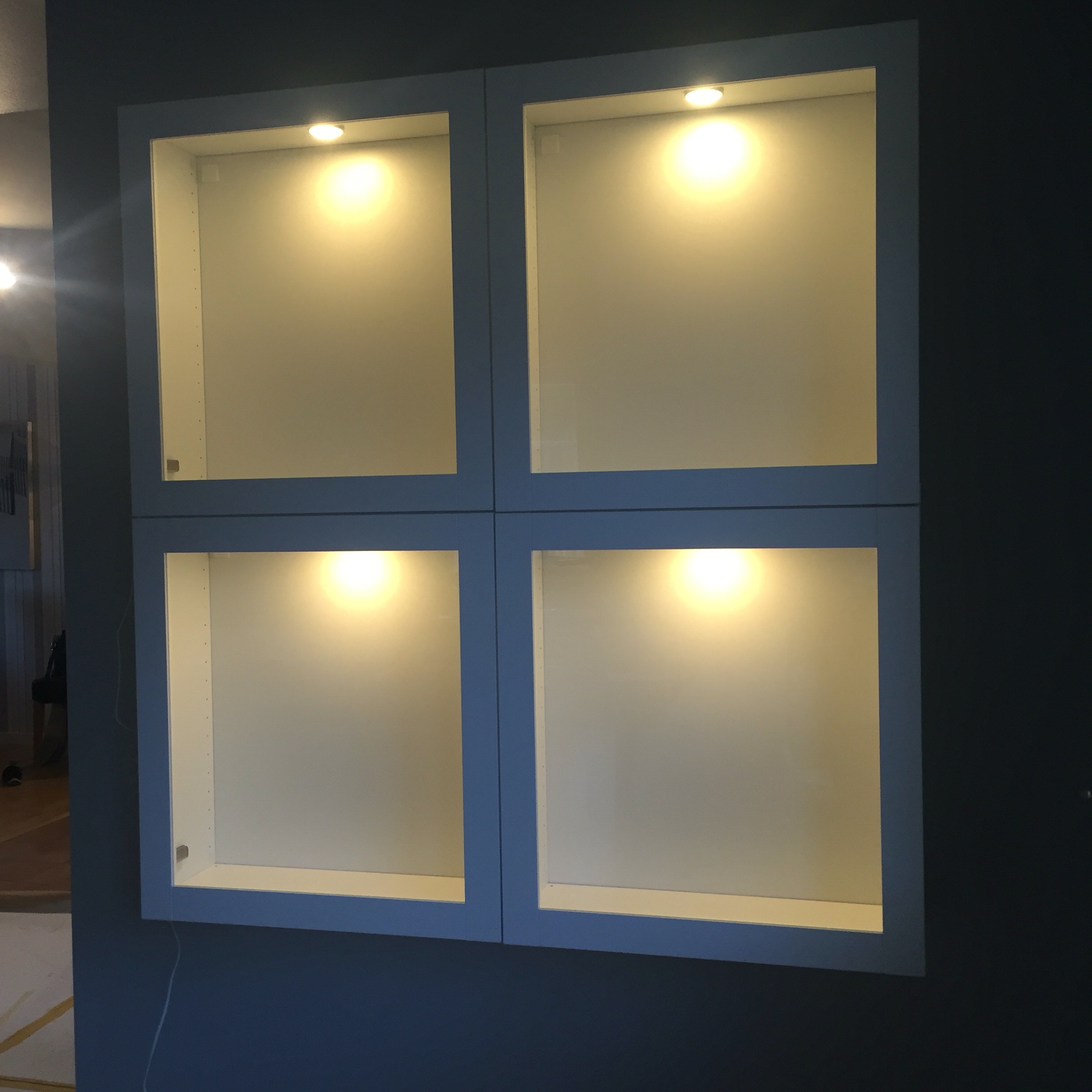 Just vitrinskåpet har varit ett litet (stort) frågetecken för mig. När vi tog ner väggen till vardagsrummet försvann väggen där vi hade vitrinskåp så hur vi skulle få till det har varit lite klurande. Från början gick funderingarna ut på att ha vitrinskåp från Kvik i samma serie som resten av köket men de vitrindörrar som fanns var inte snygga (tyckte vi). Efter det har det varit lite olika bud tills vi kom på den lösningen som det blev tillslut. Och den blev rikligt bra. Skåpen är Ikeas Bestå och de är bara 20 cm djupa så det blir lite som en maffig tavla på väggen.