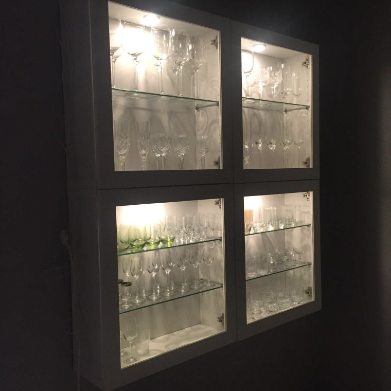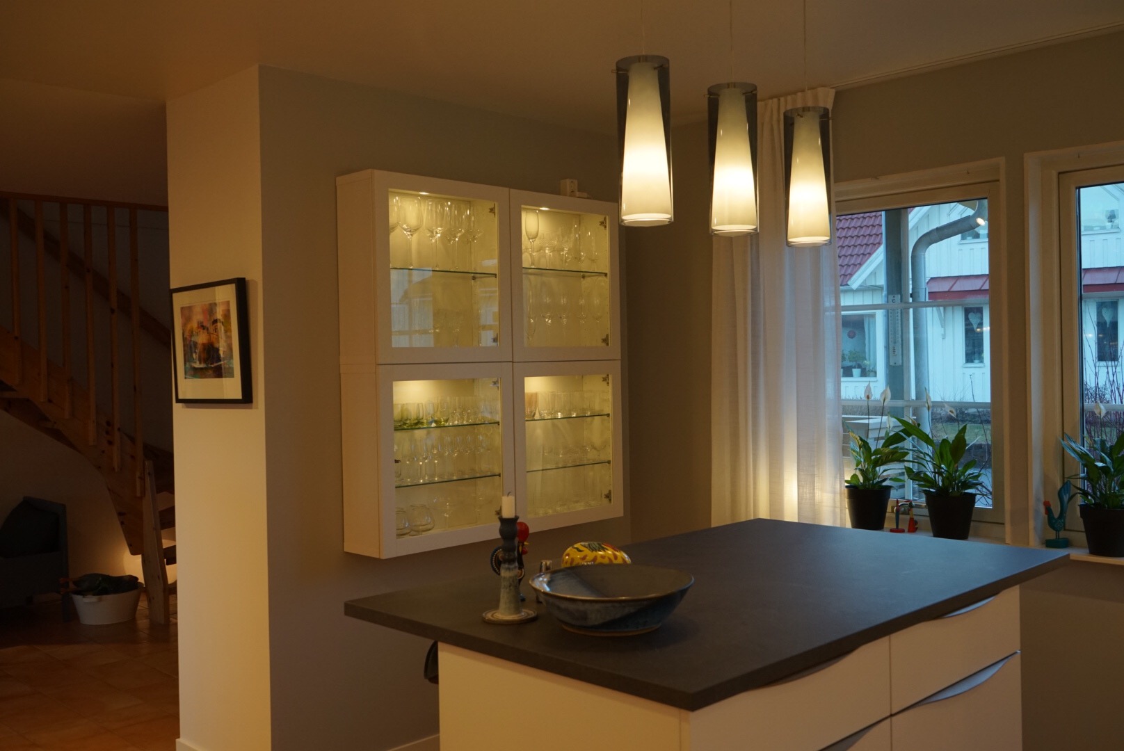 Under gårdagskvällen fick jag annars packat upp två av de 14 lådorna som köket är nerpackat i. Efter att vi fått hjälp med att få upp vårt nya vitrinskåp på väggen kunde vi montera dörrar och hyllor. Det blev tyvärr lite dubbelarbete eftersom vi valde att sätta dörrarna på plats innan hyllorna och se, det gick inte så det var bara att ta loss dörrarna igen, montera hyllorna och sedan sätta fast dörrarna igen. Först efter det kunde glasen flytta in.