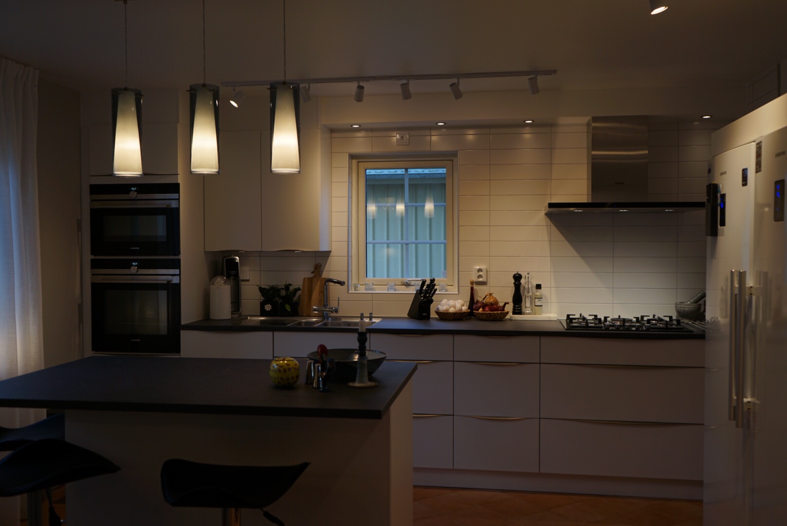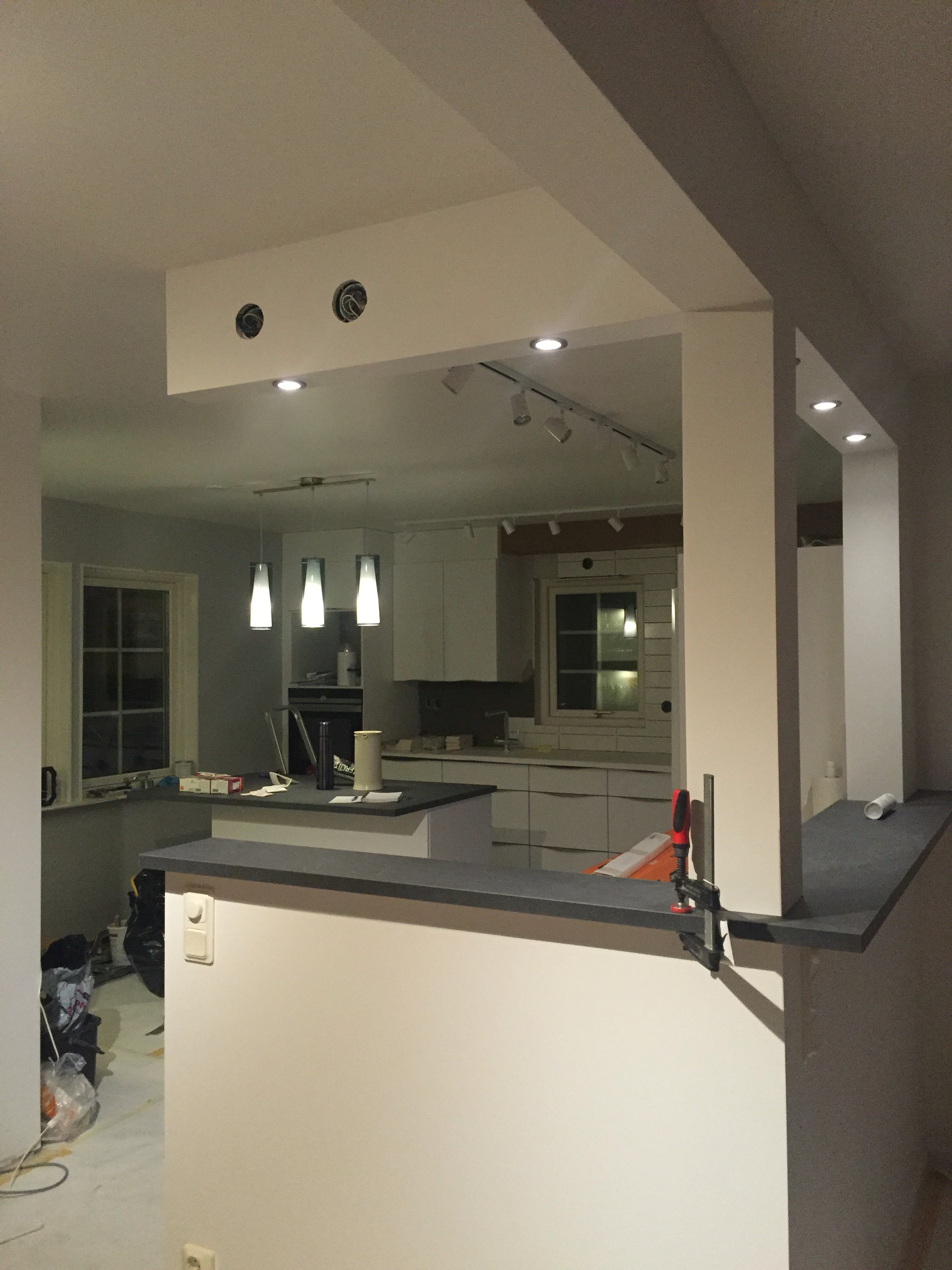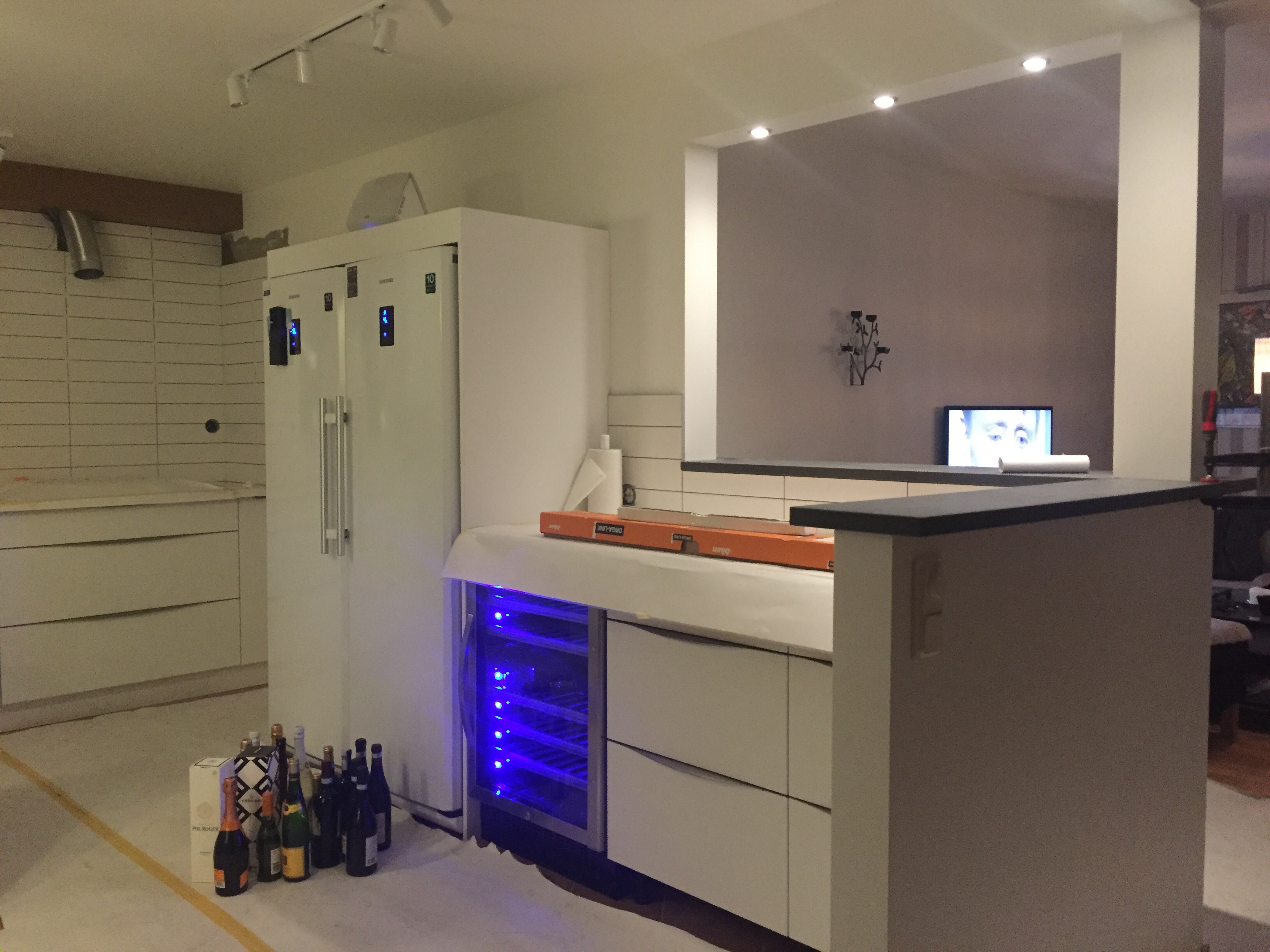 Jag kom hem och takskenorna var på plats, spottarna över bardisken infällda och igång och lampan över köksön monterad. Ja, kontakterna till kyl/frys och vinkyl var också klara. Så långt allt väl. Sen gick det fel.