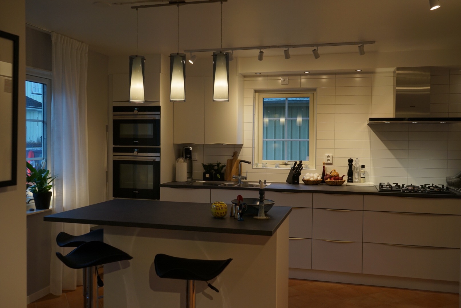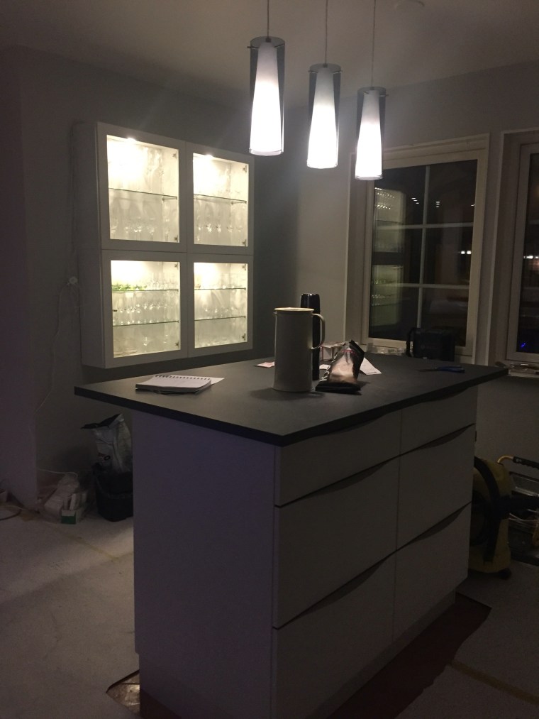 Först tappade jag en av halogenlamporna som jag skulle sätta i takskenan = glaskross, en av spottarna i takskenan lyste inte och till råga på allt slocknade båda takskenorna… Som om inte det var nog kunde vi konstatera att två av de tre innerkuporna i lampan över köksön var spruckna. Där någonstans gick min tålamodsgräns och humöret sjönk som en sten. Tänk vad tre veckors röra och stök ställer till med. Men – med tanke på att jag har dåligt tålamod från början känns de ändå som att jag varit lugn ganska länge.