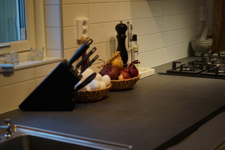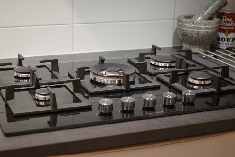 Gasspisen, eller snarare gashällen, är infälld i bänkskivan på samma sätt om en elektrisk spis. Man behöver ha en lite tjockare skiva och också titta på hur djupt delarna sticker ner under. Vi valde en skiva som är tre cm tjock och fick ha en lite grundare låda (trots extra djup bänk) under spisen. Istället för en 70 cm djup blev den 60 cm.