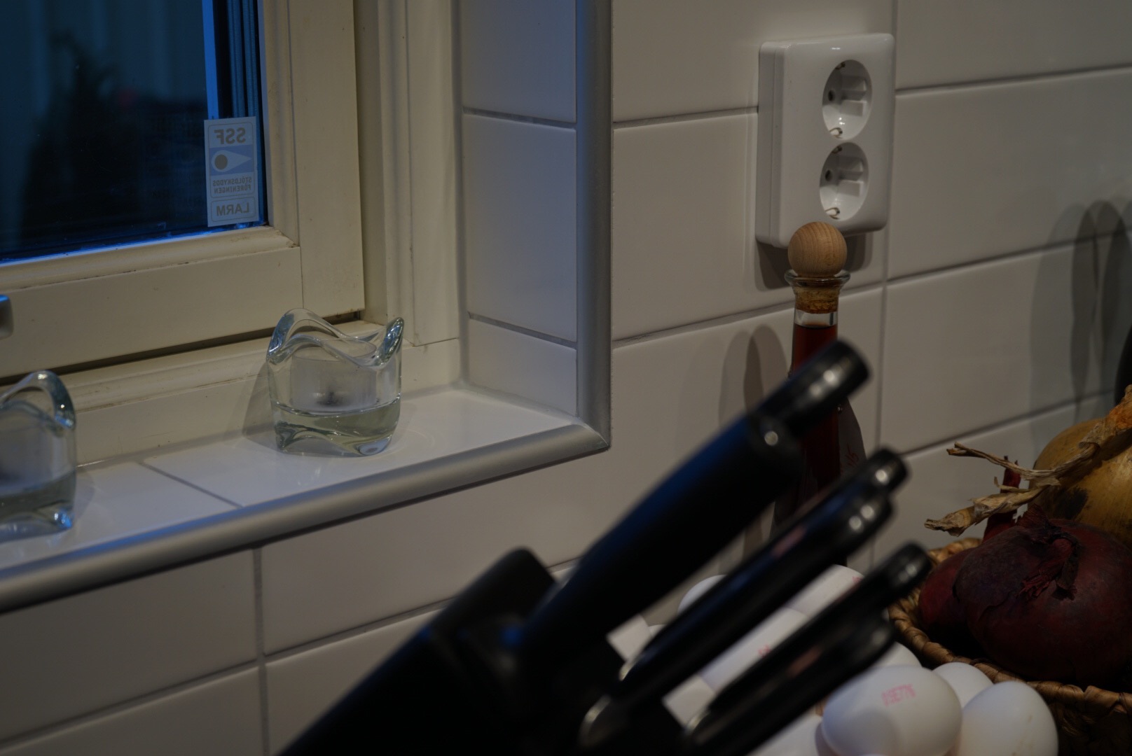 Givetvis har vi ett gaslarm inne och det är monterat under skåpet där spisen sitter. Gas är tyngre än luft och skulle en läcka uppstå ”rinner” den ner och då låter larmet.