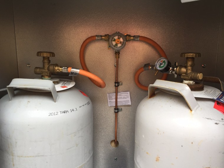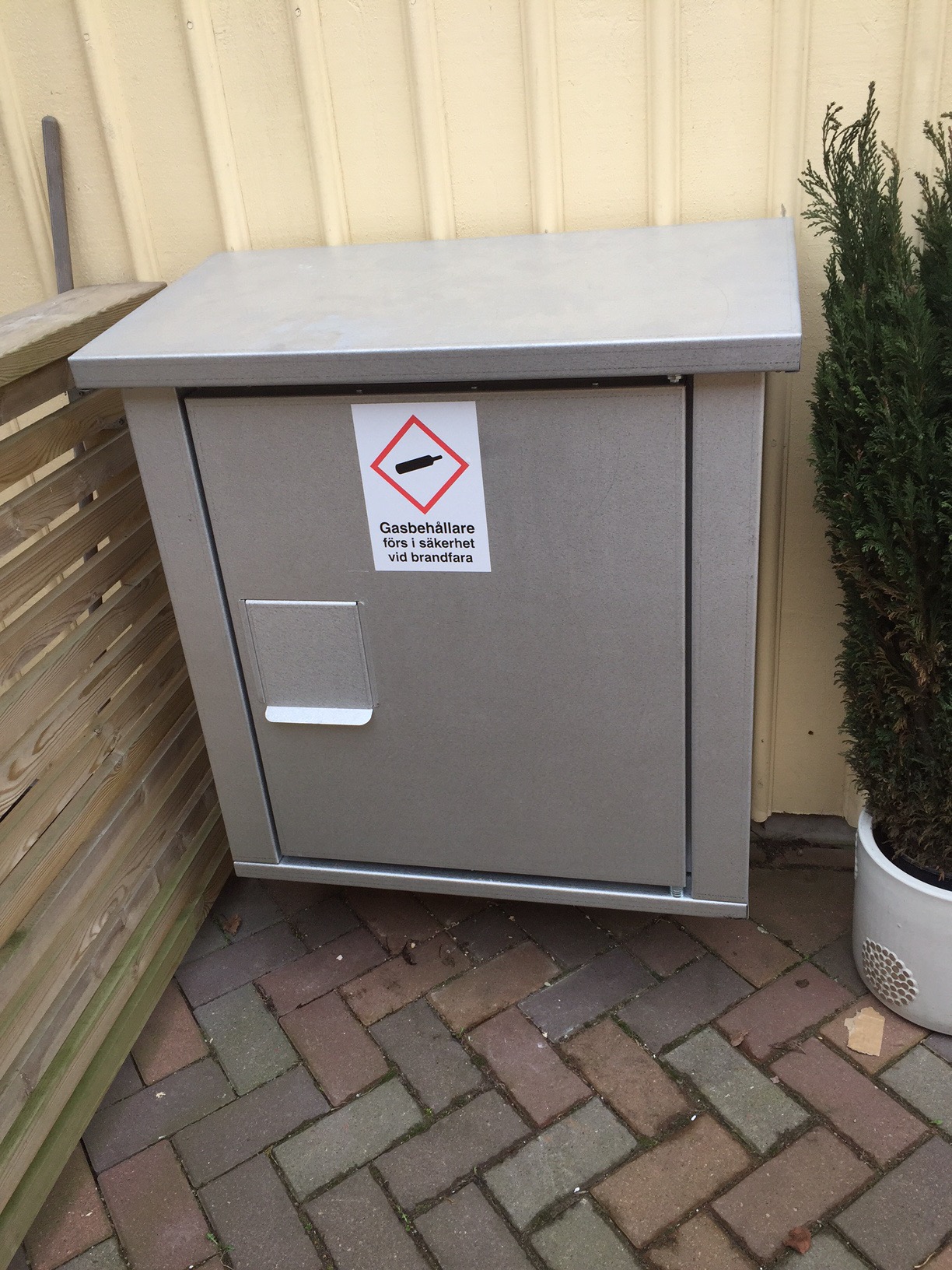 I skåpet står sedan två stycken gasolflaskor (P11) som är sammankopplade på så sätt att när den ena flaskan tar slut slår den automatiskt över till nästa. I och med att det också finns en mätare som talat om hur mycket gas det finns kvar i flaskan kan man då byta den tomma i god tid innan den andra också är tom. På så sätt står vi aldrig utan gas.