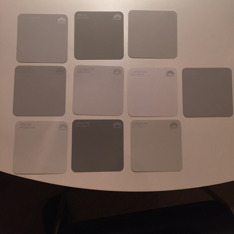 Med vita luckor och vitt kakel tror jag att vita väggar kan bli lite väl kallt i köket så vi har spånat in på grått. Grått är flott men finns i många fler än femtio nyanser och ska vara en grå färg som varken slår i lila, grönt eller blått. Varmgrå men inte för mörk.