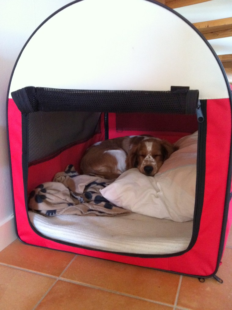 På natten vill hon gärna sova inne hos oss och det gör hon i sin koja. Visst händer det att hon vaknar på natten och då går hon ett varv i sovrummet. Först till min sida av sängen där hon ställer sig med tassarna på sängen, blir nerlyft, och sedan till makens sida där proceduren upprepas. Då går hon tillbaka till koja och somnar om. Även på förmiddagen myser hon gärna i kojan (hon är lite morgontrött) men senare på dagen lägger hon sig gärna på golvet i hörnet vid soffan. Där sover hon gott.