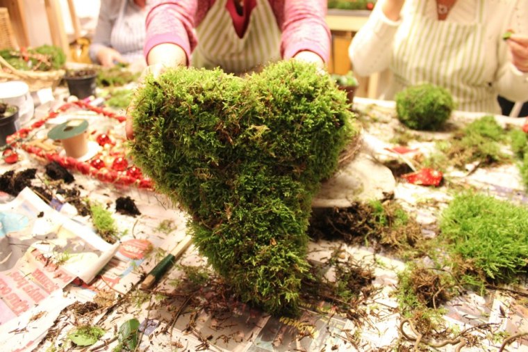 Vi hade fått tilldelat oss mossa som skulle räcka till en krans, ett hjärta och en boll. Jag valde bort bollen och gjorde ett större hjärta istället.