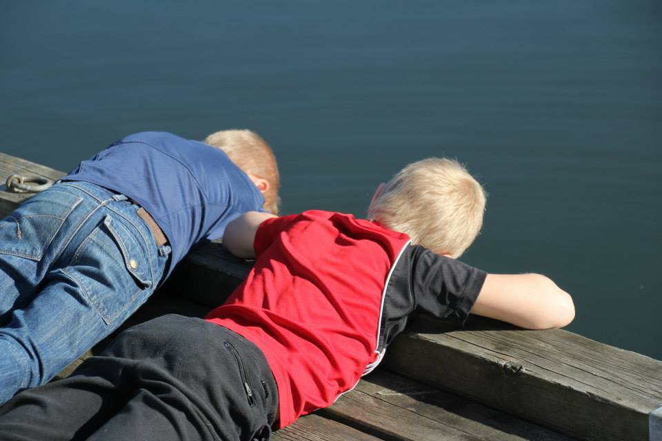 Barfota och i t-shirt och uppkavlade jeans har jag jobbat med båten. Vid fikat fångade jag kompisarnas söner på bryggan. De hade full spaning ner i vattnet. Det kalla vattnet som bara har orkat upp i ca 8 grader än så det lär dröja tills det är krabbfiskeläge på riktigt.