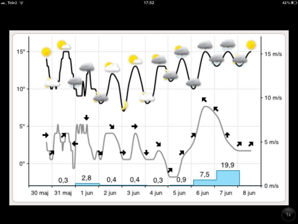 Istället åkte maken och jag ut till båten för att kolla förtöjningarna och sprack det möjligen inte upp lite. Mina förhoppningar steg igen. Kanske skulle jag komma ut på en runda ändå. Blåsten skulle jag nog kunna klara mig från i det spår jag hade tänkt mig. Väl hemma ösregnade det igen.